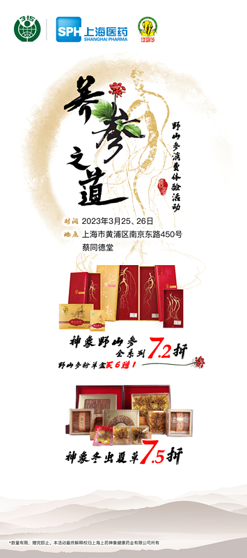 “养‘参’之道”野山参消费体验活动将于2023年3月25日(周六)下午13:00,在南京东路450号蔡同德堂正式开幕。丰富的活动期待您现场莅临体验!